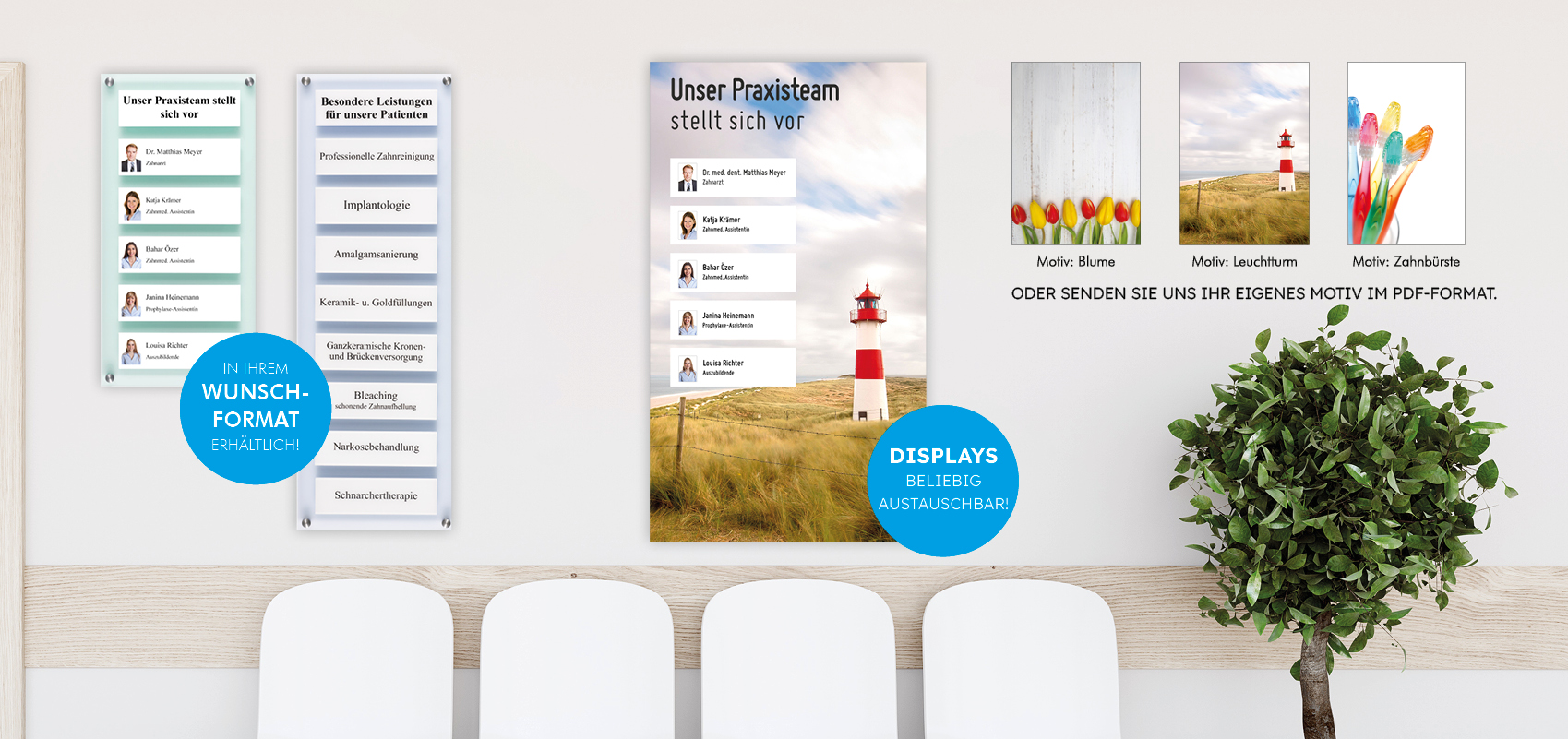Displayschilder befinden sich Magnethaftstreifen; dadurch ist ein